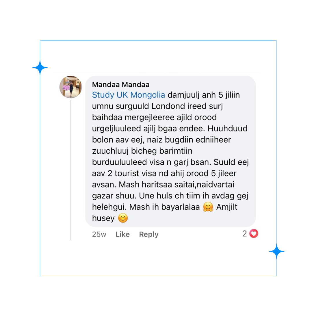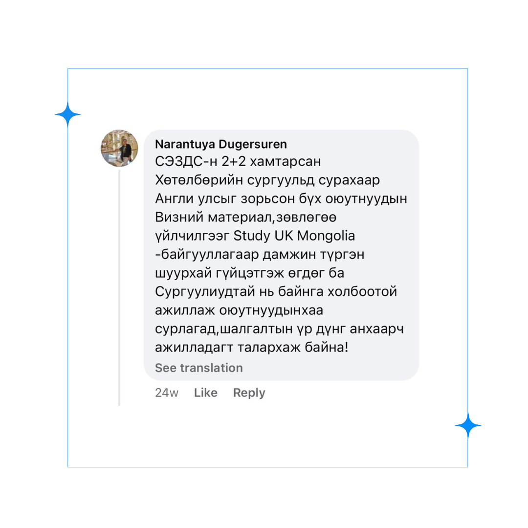 Манай байгууллага STUDY UK нь Их Британи улсад чанартай боловсрол эзэмшихийг хүссэн Монгол оюутан, сурагчдад үнэн бодит зөвлөгөө өгч, тэднийг хүсэл, зорилгод нь нийцсэн сургуулиудад амжилттай элсэхэд туслах зорилгоор 2011 онд үүсгэн байгуулагдсан. Бид одоогоор Их Британийн 100 гаруй англи хэлний сургууль, бага, дунд, ахлах сургууль болон их сургуулиудтай хамтран ажиллаж байгаа бөгөөд дэлхийн шилдэг их сургуулиудын жагсаалтад багтсан нэр хүндтэй сургуулиуд манай түншлэлийн ихэнх хувийг эзэлдэг.